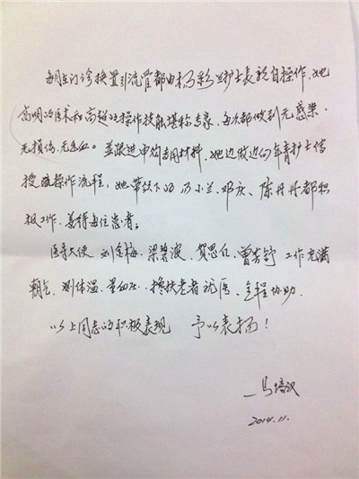(中新合資)廣州現(xiàn)代醫(yī)院的忠誠(chéng)粉絲馬培漢老人表?yè)P(yáng)門急診護(hù)理團(tuán)隊(duì)及客服團(tuán)隊(duì),信中特別提到我院的醫(yī)生和護(hù)士給了他很多的幫助,特別提到的有楊彩蘭、易小蘭、鄧慶、陳丹丹、劉金梅、梁碧波、賀思凡、陳芳舒等。他們的工作態(tài)度和細(xì)心的服務(wù),工作態(tài)度的積極與朝氣深深感動(dòng)著他,同時(shí)也感染著我們每位員工,特發(fā)感謝信以表感謝!
