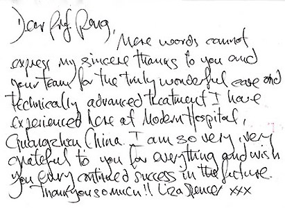 無(wú)法完全用言語(yǔ)表達(dá)我對(duì)你和你的醫(yī)療團(tuán)隊(duì)的感謝。在(中新合資)廣州現(xiàn)代醫(yī)院,我真真切切地體驗(yàn)到了無(wú)微不至的照顧以及精湛先進(jìn)的醫(yī)療技術(shù)。非常非常感謝你為我做的一切,并祝來(lái)日事業(yè)成功!