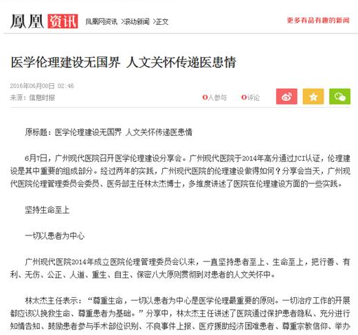 鳳凰網對我院醫(yī)學倫理建設的報道